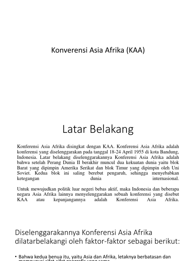 KAA adalah organisasi negara asia afrika yang memiliki perasaan senasib yaitu pernah dijajah dan percaya bahwa kemerdekaan adalah hak segala bangsa sedangkan GNB adalah. Banyak negara di dunia yang menginginkan kemerdekaan. Konferensi Asia-Afrika adalah konferensi yang diadakan di bandung pada 18 april 1955.